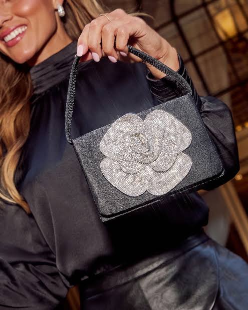 This is a black satin handbag with a rhinestone-embellished floral accent, also known as the Radiant Rose Embellished Satin Handbag, Itzel Evening Bag, or Gwenda Black Satin Rhinestone Flower Mini Handbag