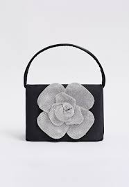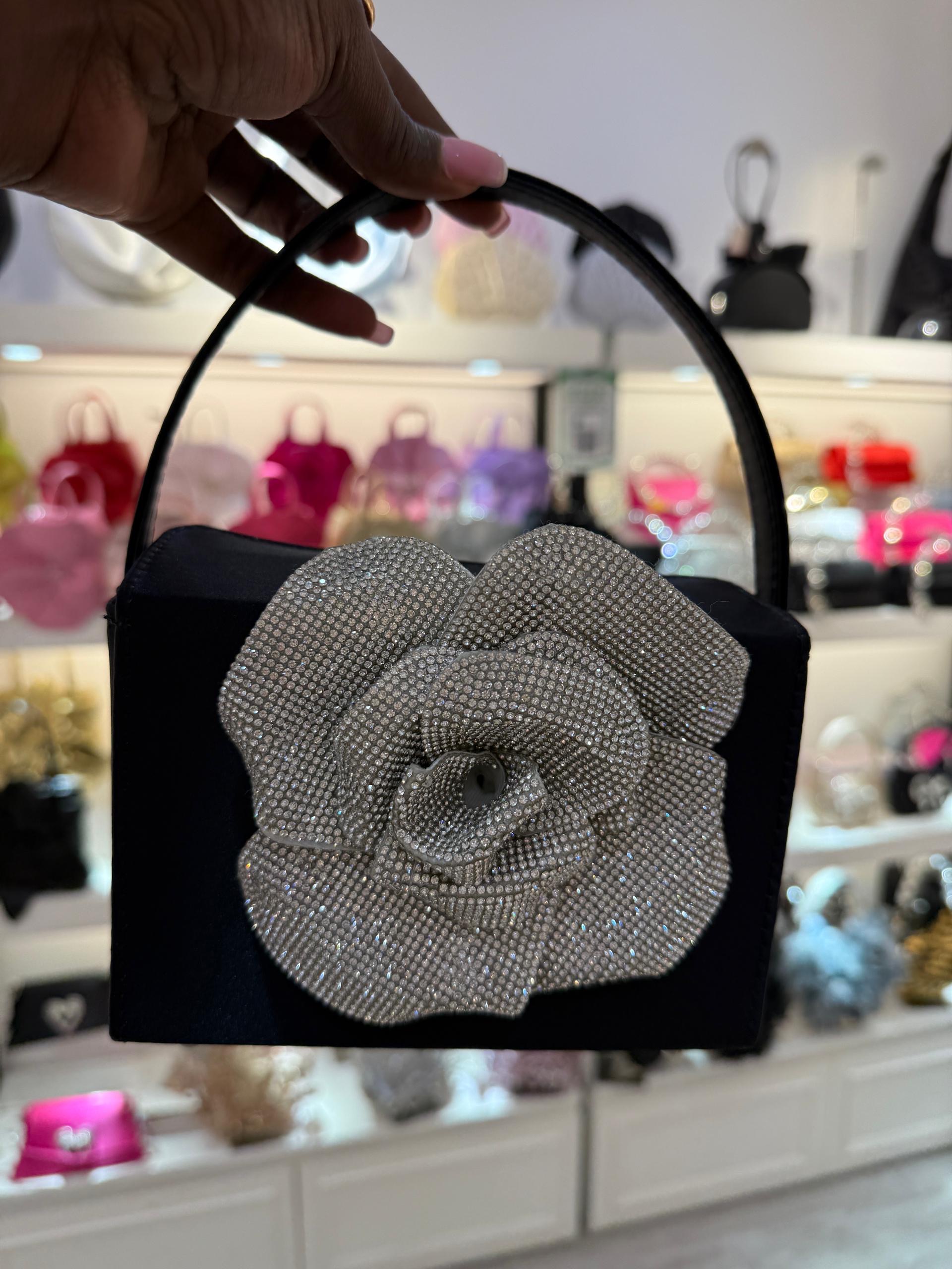 This is a black satin handbag with a rhinestone-embellished floral accent, also known as the Radiant Rose Embellished Satin Handbag, Itzel Evening Bag, or Gwenda Black Satin Rhinestone Flower Mini Handbag