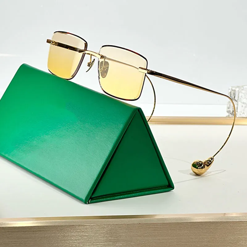 Home / Bottega, Eye wear, Shades / Drop Rectangular Sunglasses Bottega Veneta gold-tone rimless sunglasses with yellow-tinted lenses.