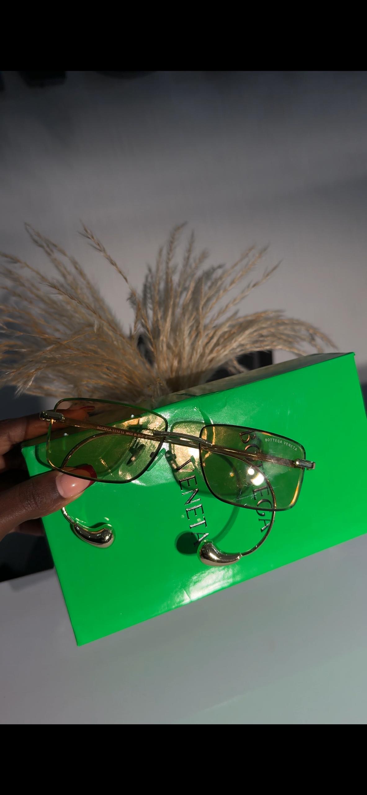 Home / Bottega, Eye wear, Shades / Drop Rectangular Sunglasses Bottega Veneta gold-tone rimless sunglasses with yellow-tinted lenses.