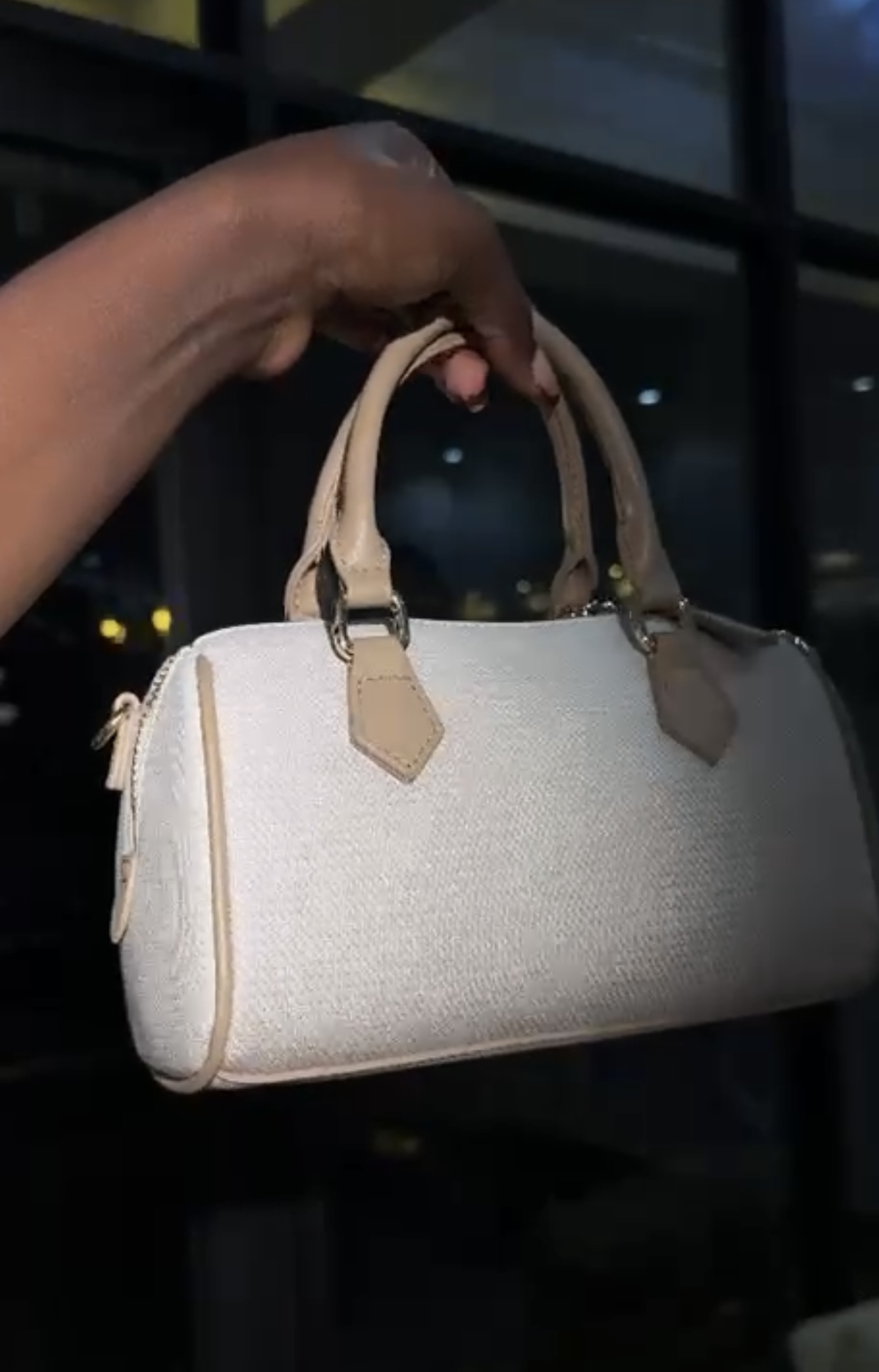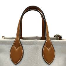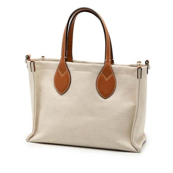 off-white canvas/linen blend tote bag with tan/beige leather handles and accents.